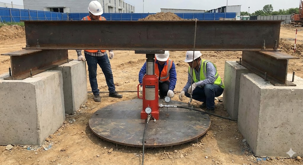 地面に鋼製の円形プレートを設置し、徐々に荷重をかけて地盤がどれだけ沈むかを観測することで、